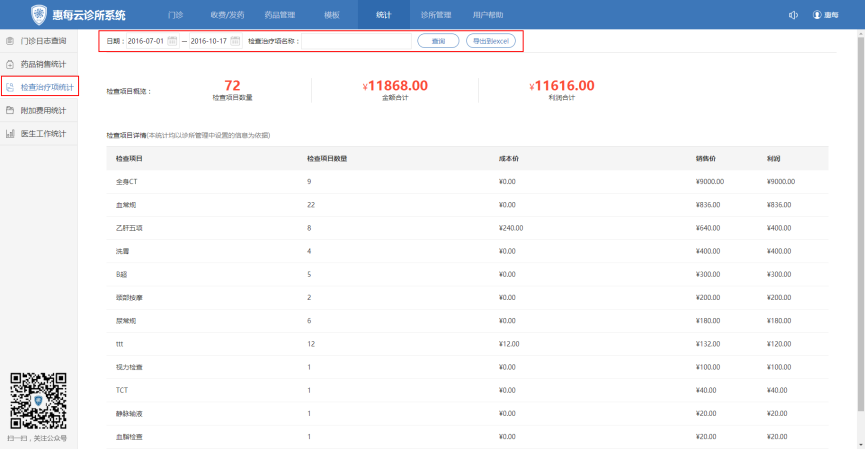 - 1. 进入统计→检查治疗项统计